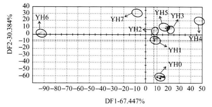 采用PCA法對(duì)第3組樣品進(jìn)行分析,由圖8可得出,優(yōu)化傳感器后,2個(gè)主成分的貢獻(xiàn)率分別為82.306%、10.428%,總貢獻(xiàn)率達(dá)到92.734%,不同樣品組的數(shù)據(jù)點(diǎn)分布在4個(gè)象限,YH2與YH3有小部分重疊,其他樣品在主成分分析圖上可以較好區(qū)分,說明提取的信息能基本反映數(shù)據(jù)信息。由圖9可以看出,判別因子1和判別因子2的貢獻(xiàn)率為67.447%、30.364%,總貢獻(xiàn)率為97.811%,其中YH3與YH2有重疊,其他樣品可較好分開,分布在3個(gè)不同象限且組內(nèi)的數(shù)據(jù)點(diǎn)比較集中。綜合比較圖8、9,可得出2種方法均能對(duì)亞麻籽油混樣進(jìn)行區(qū)分,而DFA法要優(yōu)于PCA法。