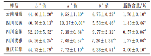 采用全自動(dòng)色差儀測(cè)量魚(yú)片表面的顏色,每次測(cè)試前進(jìn)行校準(zhǔn)。測(cè)量白度(L*值)、紅度(a*值)和黃度(b*值)。不同產(chǎn)地的青花椒對(duì)花椒魚(yú)片的色澤和脂肪含量的影響不同,結(jié)果見(jiàn)表2。