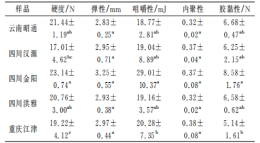 采用質(zhì)構(gòu)儀測(cè)定硬度、彈性、咀嚼性、內(nèi)聚性、膠黏性5個(gè)指標(biāo),判斷魚(yú)肉質(zhì)構(gòu)的變化。不同產(chǎn)地的青花椒對(duì)花椒魚(yú)片質(zhì)構(gòu)特性的影響不同,結(jié)果見(jiàn)表3。