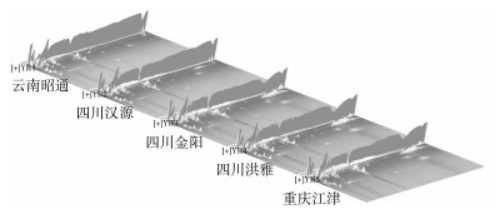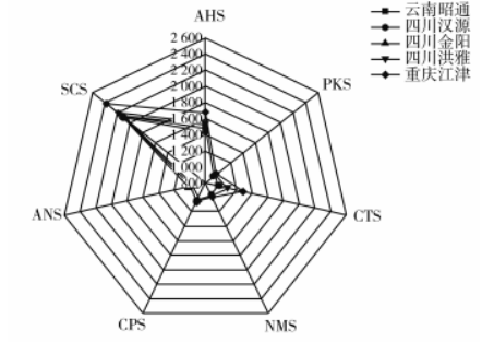利用電子舌檢測(cè)儀自帶軟件對(duì)花椒魚(yú)片樣品的數(shù)據(jù)進(jìn)行主成分分析(PCA),結(jié)果見(jiàn)圖5。主成分1和主成分2的貢獻(xiàn)率分別為94.356%和5.388%,總貢獻(xiàn)率達(dá)99.744%,超過(guò)85%,表明這兩個(gè)主成分涵蓋了大多數(shù)樣品信息,可以用來(lái)表征花椒魚(yú)片樣品的滋味特征。5種樣品散點(diǎn)區(qū)域分散明顯,表明電子舌能夠較好地區(qū)分不同產(chǎn)地的花椒魚(yú)片。由圖5可知,重慶江津樣品組與其他4組樣品的滋味差異最大。由圖6可知,花椒魚(yú)片在傳感器SCS、AHS、CTS、NMS上響應(yīng)值較高,其中AHS、CTS、NMS分別為酸味、咸味、鮮味專一性傳感器,SCS為非專一性傳感器。差異性最大的SCS傳感器可能和青花椒中麻味物質(zhì)含量的高低有關(guān),其中重慶江津樣品組的響應(yīng)值最大。