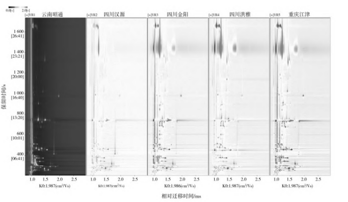青花椒產(chǎn)地對(duì)花椒魚(yú)片風(fēng)味物質(zhì)的影響花椒魚(yú)片樣品的揮發(fā)性物質(zhì)GC-IMS三維圖譜見(jiàn)圖2。圖2中每個(gè)反應(yīng)離子峰代表一種揮發(fā)性風(fēng)味物質(zhì),顏色越深,表示物質(zhì)越豐富。使用不同產(chǎn)地的青花椒制作花椒魚(yú)片時(shí),可以直觀地看到四川金陽(yáng)和重慶江津樣品組中風(fēng)味物質(zhì)的種類和濃度與其他樣品組差異較明顯。花椒魚(yú)片特征性風(fēng)味成分GC-IMS差異譜圖見(jiàn)圖3,此圖是將圖2的三維圖投影到二維平面上的俯視圖,具體是以氣相色譜的保留時(shí)間作為縱坐標(biāo),以離子遷移時(shí)間作為橫坐標(biāo),以云南昭通青花椒樣品組譜圖為參比,將另外4個(gè)樣品組的譜圖扣減參比后得到的。差異圖譜中每個(gè)點(diǎn)代表一種揮發(fā)性風(fēng)味物質(zhì)。結(jié)果顯示,與云南昭通樣品組相比,四川金陽(yáng)和重慶江津樣品組的風(fēng)味物質(zhì)濃度較高。