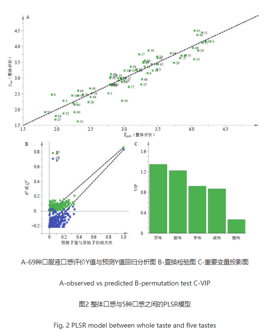 口服液整體口感預測模型:置換檢驗的R2回歸線的Y軸截距為−0.0176,Q2回歸線的Y軸截距為−0.3290,表明建立的模型沒有出現(xiàn)過度擬合,預測能力良好;圖2-C為口嘗結果PLSR模型獲取其變量重要性投影圖,通過該模型獲取其變量重要性投影(variableimportancefortheproject,VIP)值,VIP值是反映自變量對因變量的解釋能力的重要指標,VIP值越大說明自變量對因變量解釋能力越強,其中苦味和甜味VIP值>1,說明苦味和甜味是影響口服液整體口感的重要變量。